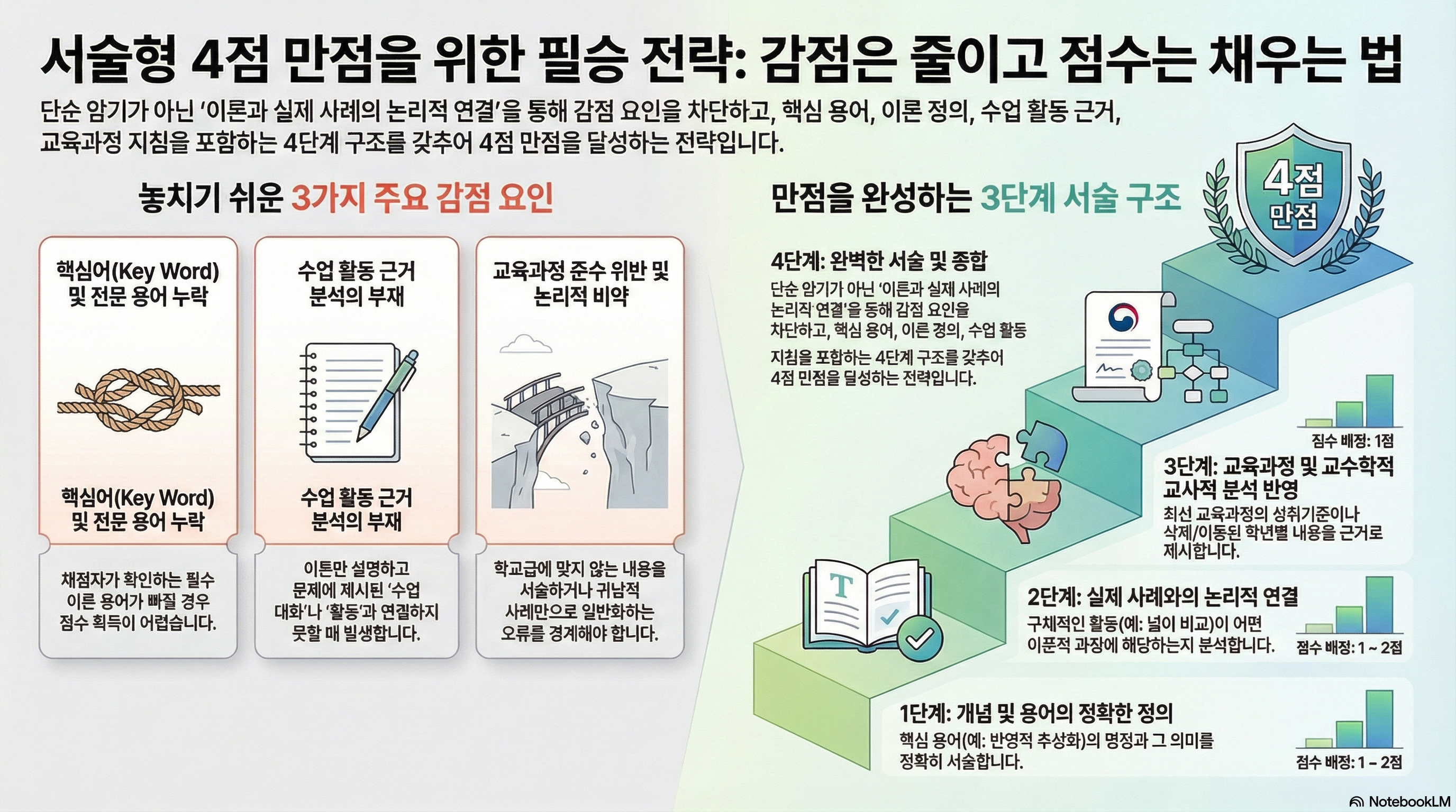 결론적으로, 서술형 만점을 위해서는 "핵심 용어 기입 + 이론의 정의 + 수업 활동 근거 분석 + 교육과정 지침 반영"의 4단계 구조를 갖추는 것이 가장 안전합니다.